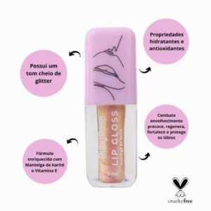 O Lip Gloss possui um tom cheio de glitter e muita hidratação para os lábios. Sua fórmula exclusiva é enriquecida com Manteiga de karité e Vitamina E que possui propriedades hidratantes e antioxidantes, combatendo o envelhecimento precoce, regenerando, fortalecendo e protegendo os lábios. Não testado em animais.